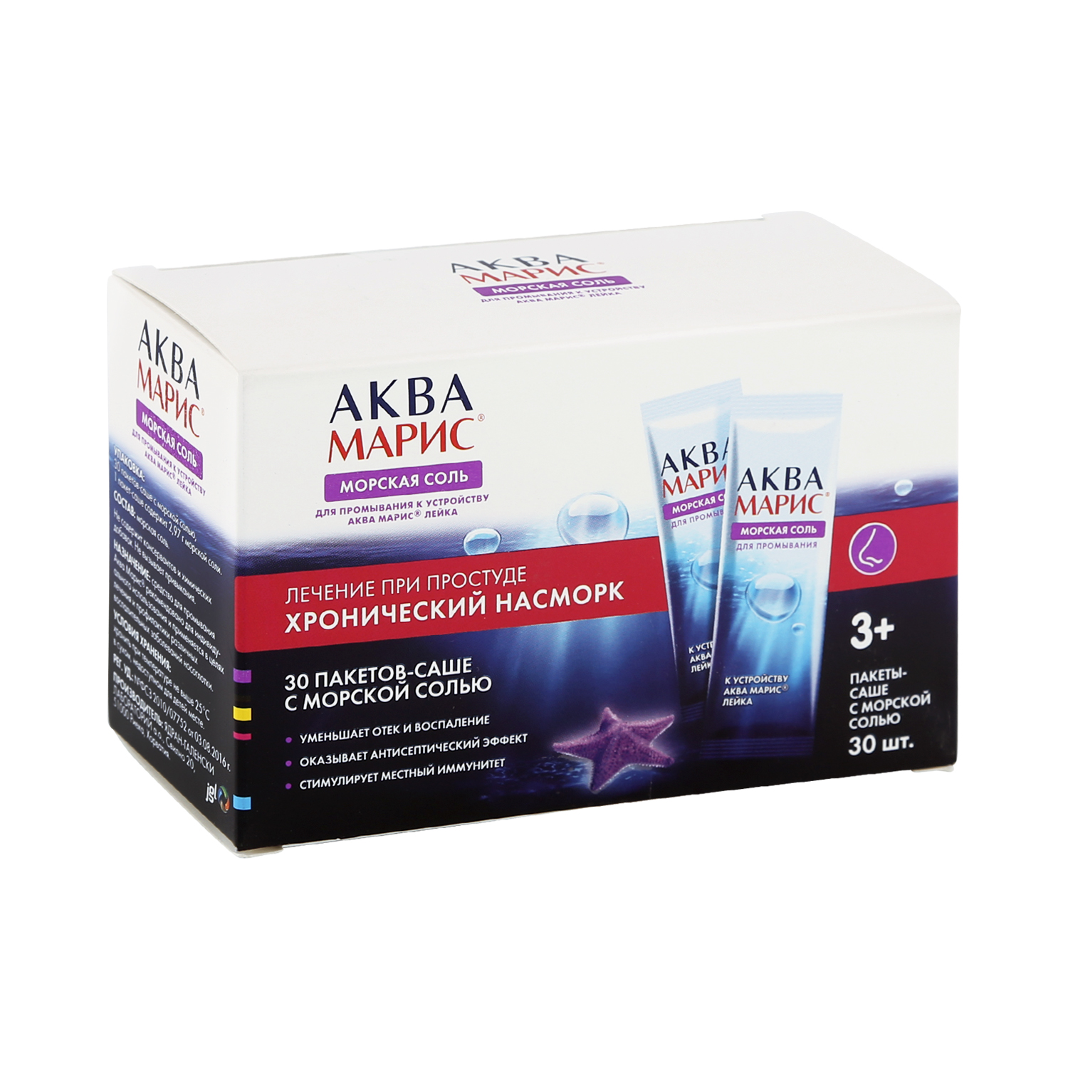 Средство для промывания Аква Марис® представляет собой 30 пакетов-саше с солью Адриатического моря, богатой полезными микроэлементами и минералами. Средство используется совместно с Устройством для промывания Аква Марис® Лейка. 1 пакет-саше содержит 2,97 г морской соли. При промывании полости носа с помощью средства для промывания Аква Марис® с поверхности слизистой оболочки удаляется патологическое содержимое вместе с вирусами, бактериями, аллергенами и пылью, уменьшается отек и воспаление, повышается тонус капилляров.