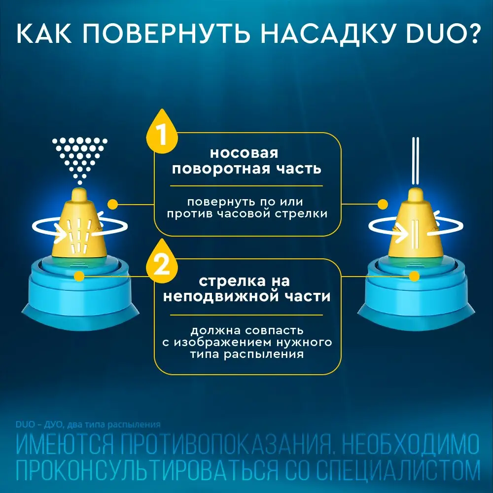 В случае использования средства с поворотной насадкой выберите требуемый тип распыления «душ» или «струя» согласно рекомендациям врача или в зависимости от степени выраженности симптомов, характера выделений и индивидуальных предпочтений. Для выбора варианта «душ» Вам потребуется повернуть по или против часовой стрелки носовую поворотную часть насадки таким образом, чтобы изображение стрелки на неподвижной части насадки совпало с изображением распыления типа «душ» на ее поворотной части. Для выбора варианта «струя» Вам потребуется повернуть по или против часовой стрелки носовую поворотную часть насадки таким образом, чтобы изображение стрелки на неподвижной части насадки совпало с изображением распыления типа «струя» на ее поворотной части (рис.1).