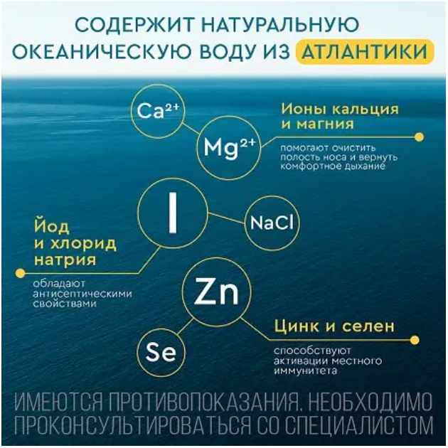 | Состав содержимого | гипертонический раствор морской воды (концентрация NaCl 19 - 23 г/л), содержащий воду морскую натуральную, воду очищенную Забор воды морской осуществляется из экологически чистых районов у берегов Бретани (Франция), Люсешил (Швеция). Вода морская содержит ионы натрия, калия, цинка, селена, магния, кальция, йода, хлора, брома. рН 6,0 - 8,5 не содержит консервантов |