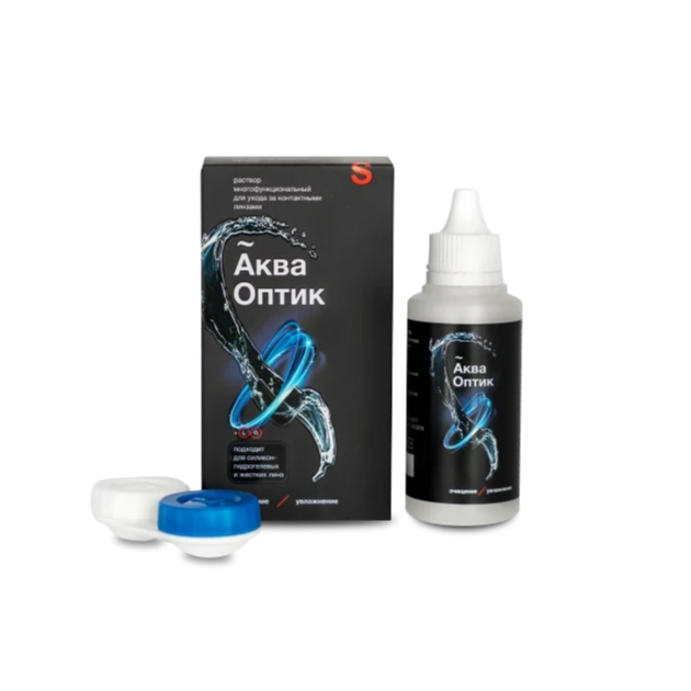 Раствор многофункциональный для ухода за контактными линзами АкваОптик (далее - раствор) представляет собой прозрачный или слегка опалесцирующий бесцветный раствор.