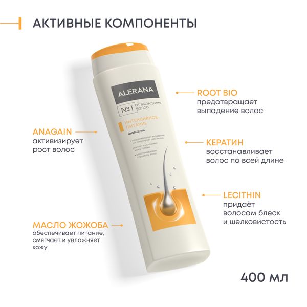 Шампунь ALERANA интенсивное питание обеспечивает интенсивное питание тонких, ослабленных, склонных к выпадению волос.