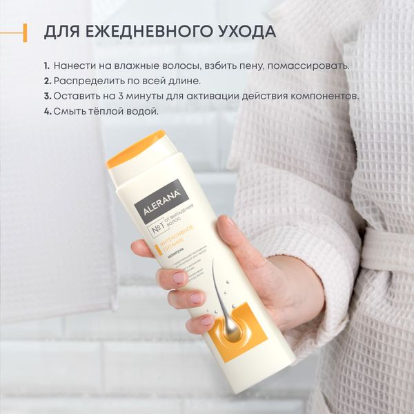 Небольшое количество шампуня нанести на влажные волосы, взбить пену, помассировать, оставить на 1-3 минуты, затем смыть теплой водой. Для достижения наилучшего эффекта после применения шампуня рекомендуется использовать бальзам-ополаскиватель ALERANA.