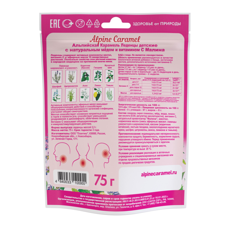 Сколько стоит Alpine Caramel Альпийская Карамель леденцы детские с натуральным медом и витамином С Малина пакет 75г - цена и отзывы