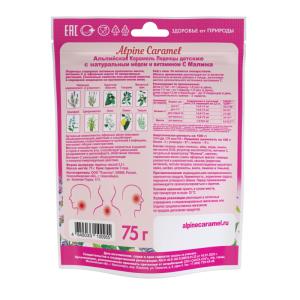 Купить Alpine Caramel Альпийская Карамель леденцы детские с натуральным медом и витамином С Малина пакет 75г по низкой цене