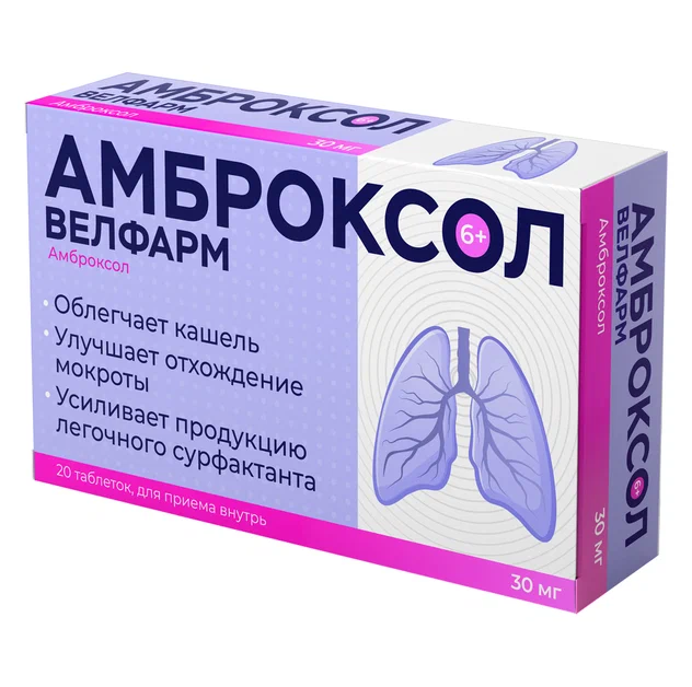 Действующее вещество: амброксола гидрохлорид — 30,0 мг.