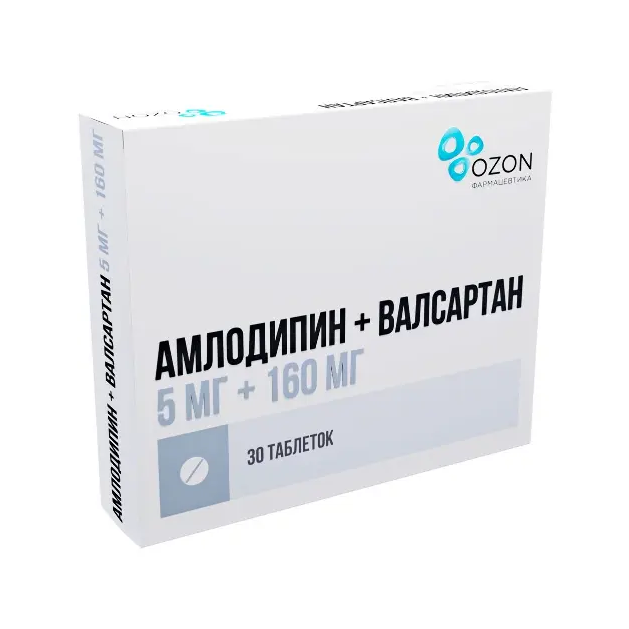 Активные вещества: амлодипина безилат — 6,94 мг в пересчёте на амлодипин — 5,00 мг, валсартан — 160,00 мг.