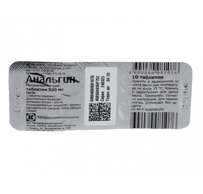 Активное вещество: ;метамизол натрия (анальгин) 500 ;мг