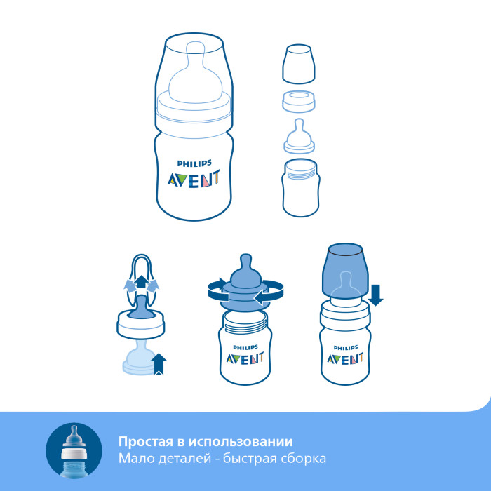 Легко собирать. Бутылочка Anti-colic имеет небольшое количество деталей для быстрой и удобной сборки.