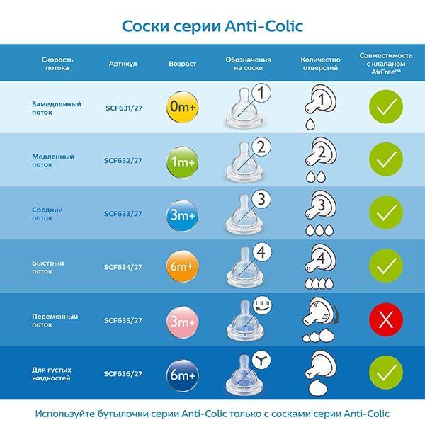 Доступны соски разной скорости потока для кормления вашего растущего малыша. Соски Philips Avent серии Anti-Colic имеют разную скорость потока — предпочтительная скорость зависит от возраста и индивидуальных особенностей малыша. Мы рекомендуем менять соску каждые 3 месяца в гигиенических целях. Используйте бутылочки Philips Avent серии Anti-Colic только вместе с сосками Philips Avent серии Anti-Colic. Бутылочки Philips Avent серии Anti-Colic совместимы с клапаном AirFree. Бутылочку можно использовать с ним и без него, в зависимости от ваших потребностей.