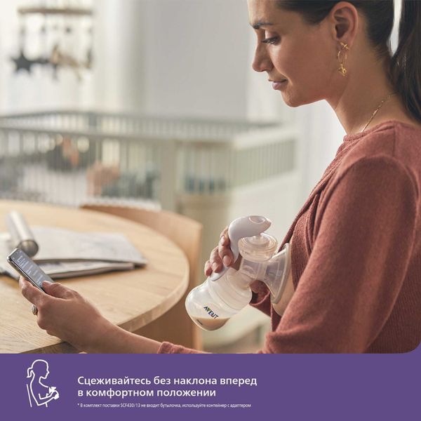 Расслабьтесь и займите удобное сидячее положение при сцеживании - благодаря специальной конструкции насадки молокоотсос позволяет сидеть ровно, не наклоняясь вперед.