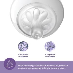 Соска Natural - соска ощущается как грудь. Легко сочетать c кормлением грудью и из бутылочки. Соска Natural Response - молоко выделяется только при активном сосании: соска ощущается и работает, как грудь. Конструкция соски позволяет избежать случайное проливание молока. Совместимы с клапаном AirFree, снижающим риски образования колик, газов и срыгивании.