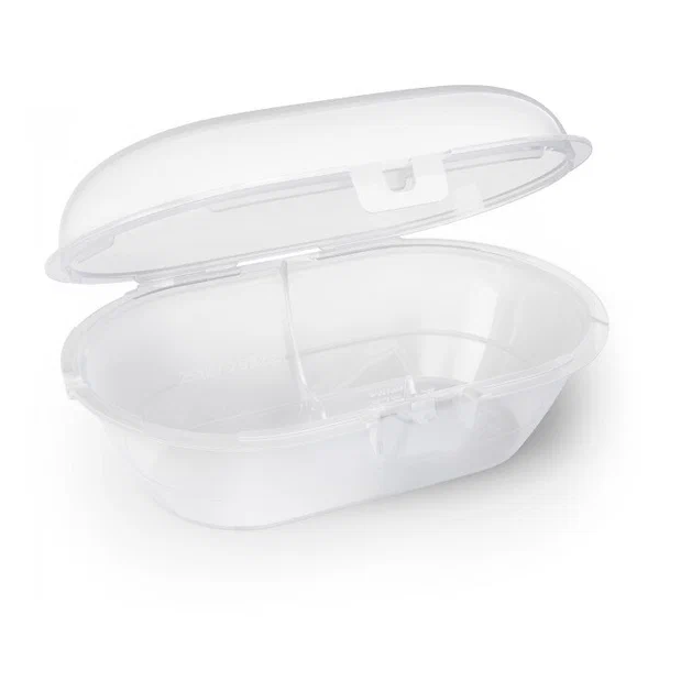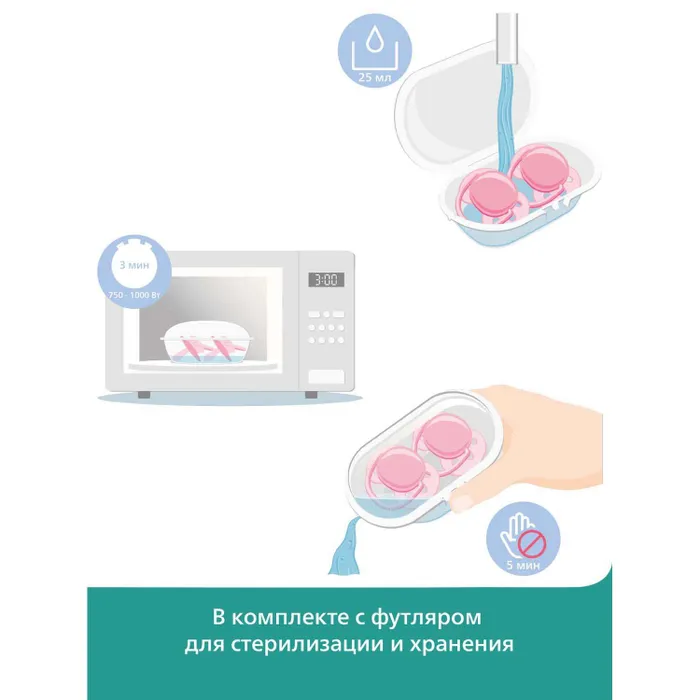 Положите в футляр хорошо промытые пустышки, добавьте 25 мл воды и поставьте его в микроволновую печь на 3 минуты при мощности 750-1000 Вт. Охладите в течение 5 минут, вылейте из футляра воду - и процесс завершен!