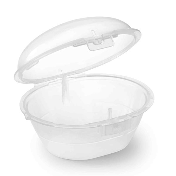 Положите в футляр хорошо промытые пустышки, добавьте 25 мл воды и поставьте его в микроволновую печь на 3 минуты при мощности 750-1000 Вт. Охладите в течение 5 минут, вылейте из футляра воду - и процесс завершен!