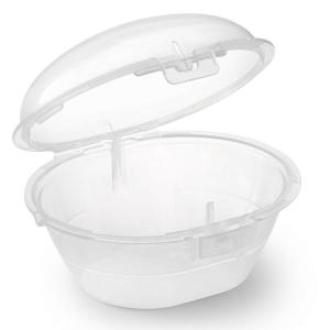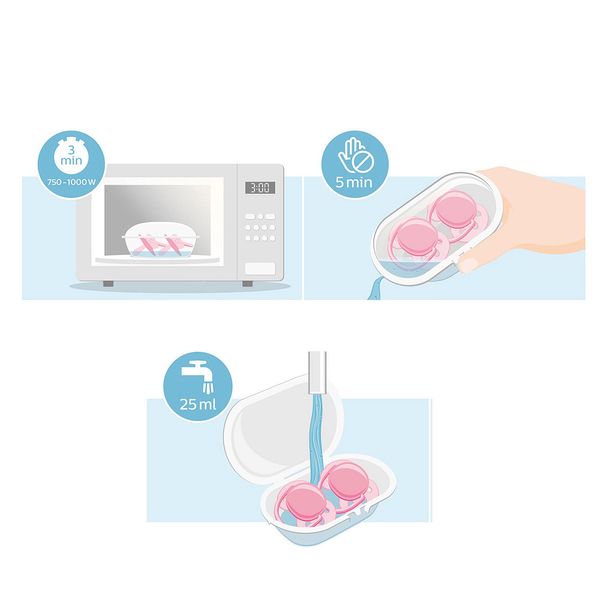 Положите в футляр хорошо промытые пустышки, добавьте 25 мл воды и поставьте его в микроволновую печь на 3 минуты при мощности 750-1000 Вт. Охладите в течение 5 минут, вылейте из футляра воду - и процесс завершен!