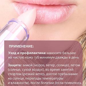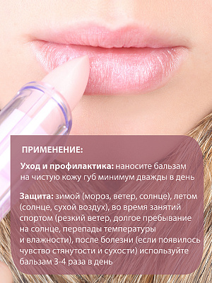 Защита: зимой (мороз, ветер, солнце), летом (солнце, сухой воздух), во время занятий спортом (резкий ветер, долгое пребывание на солнце, перепады температуры и влажности), после болезни (если появилось чувство стянутости и сухости) используйте бальзам 3-4 раза в день