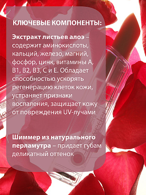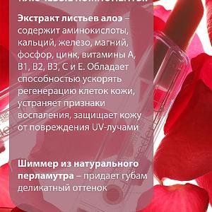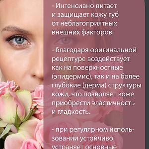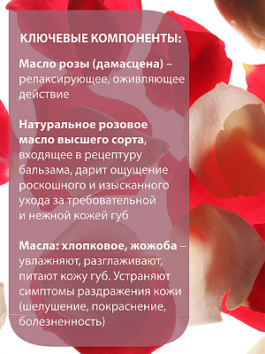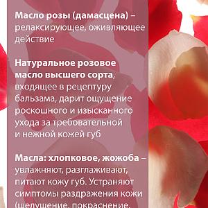 Натуральное розовое масло высшего сорта, входящее в рецептуру бальзама, дарит ощущение роскошного и изысканного ухода за требовательной и нежной кожей губ.