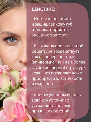 - При регулярном использовании устойчиво устраняет основные признаки старения – сухость, исчерченность кожи губ - и позволит сохранить кожу губ гладкой и упругой.