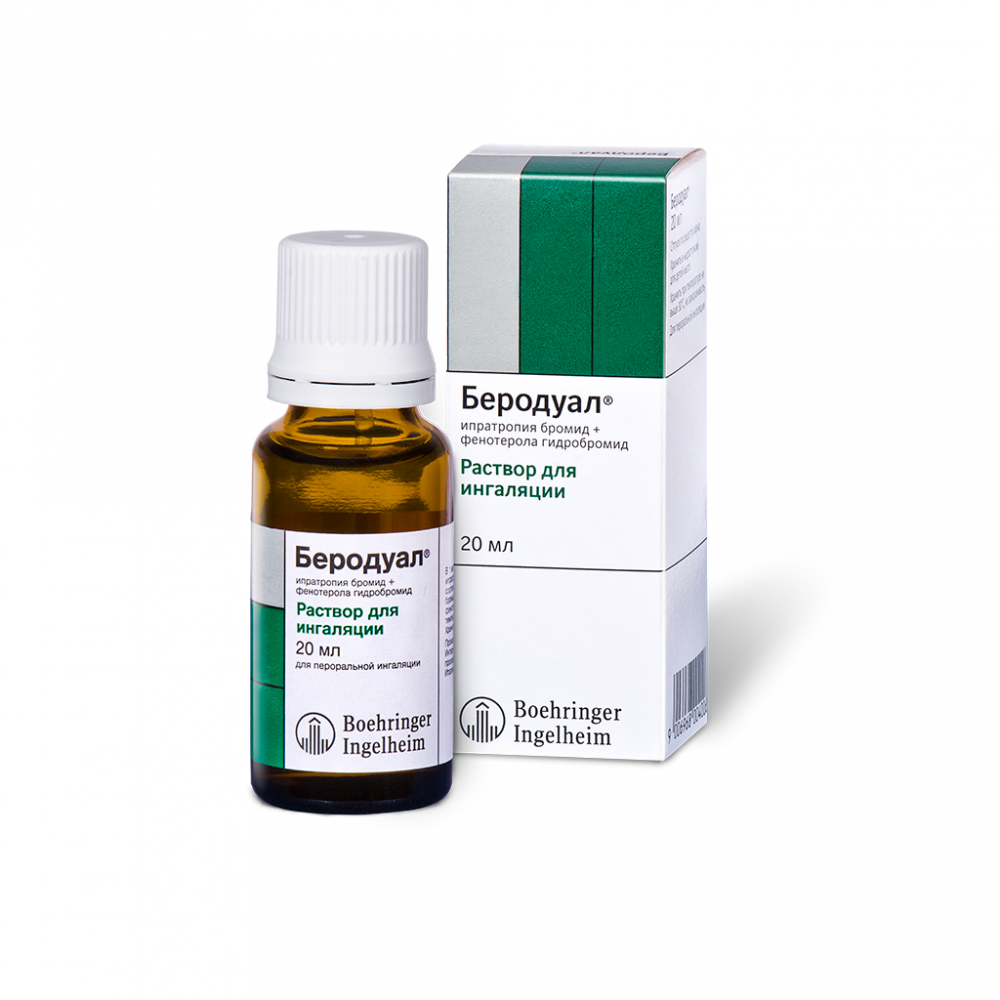 БЕРОДУАЛ® содержит два компонента, обладающих бронхолитической активностью: ипратропия бромид — м-холиноблокатор, и фенотерол — β2-адреномиметик.