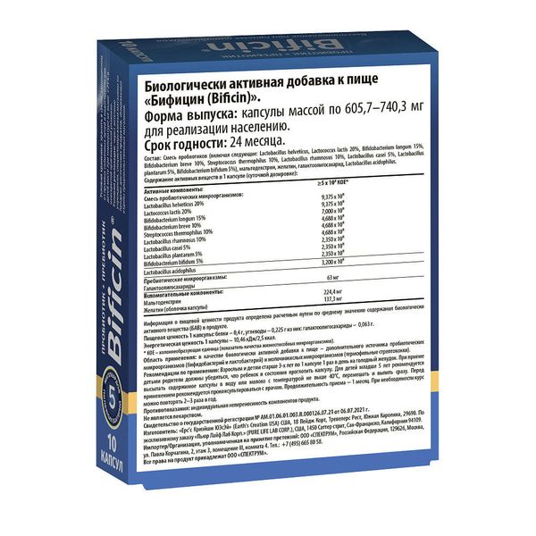 Каждая капсула Бифицин® содержит пять миллиардов пробиотических микроорганизмов (5,0 х 10*9 КОЕ/капс.).
