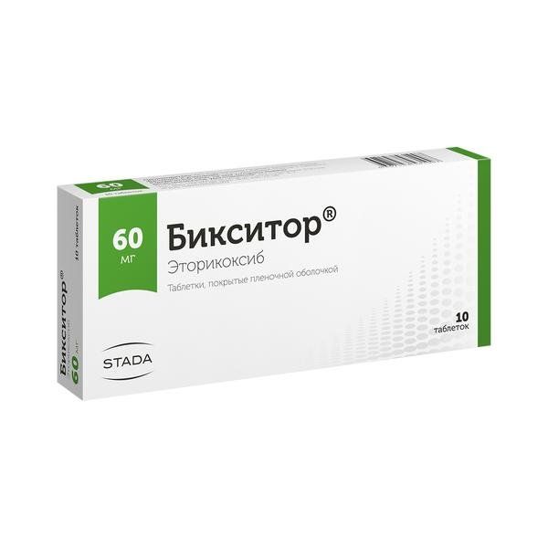 Ацетилсалициловая кислота. В исследовании с участием здоровых добровольцев эторикоксиб в дозе 120 мг в день в равновесном состоянии не влиял на антитромбоцитарную активность ацетилсалициловой кислоты (81 мг 1 раз в день). Препарат Бикситор® можно применять одновременно с ацетилсалициловой кислотой в низких дозах, предназначенных для профилактики СС заболеваний. Однако одновременное назначение низких доз ацетилсалициловой кислоты и эторикоксиба может привести к увеличению частоты язвенного поражения ЖКТ и других осложнений по сравнению с приёмом одного эторикоксиба. Одновременное применение эторикоксиба с ацетилсалициловой кислотой в дозах, превышающих рекомендованные для профилактики СС осложнений, а также с другими НПВП не рекомендуется.