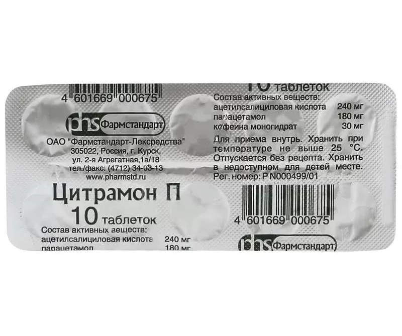 Активные вещества: ацетилсалициловая кислота — 240 мг, парацетамол — 180 мг, кофеина моногидрат или кофеин (кофеин безводный) — 30 мг.