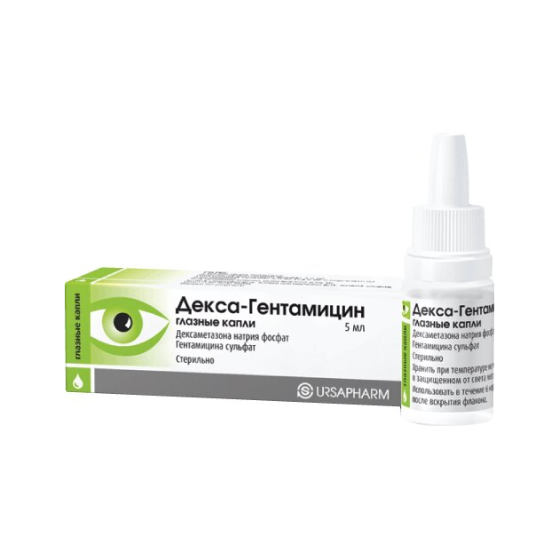 Активные компоненты: Дексаметазона натрия фосфат 1,0 мг, Гентамицина сульфат 5,0 мг (=3,0 мг в пересчёте на гентамицин).