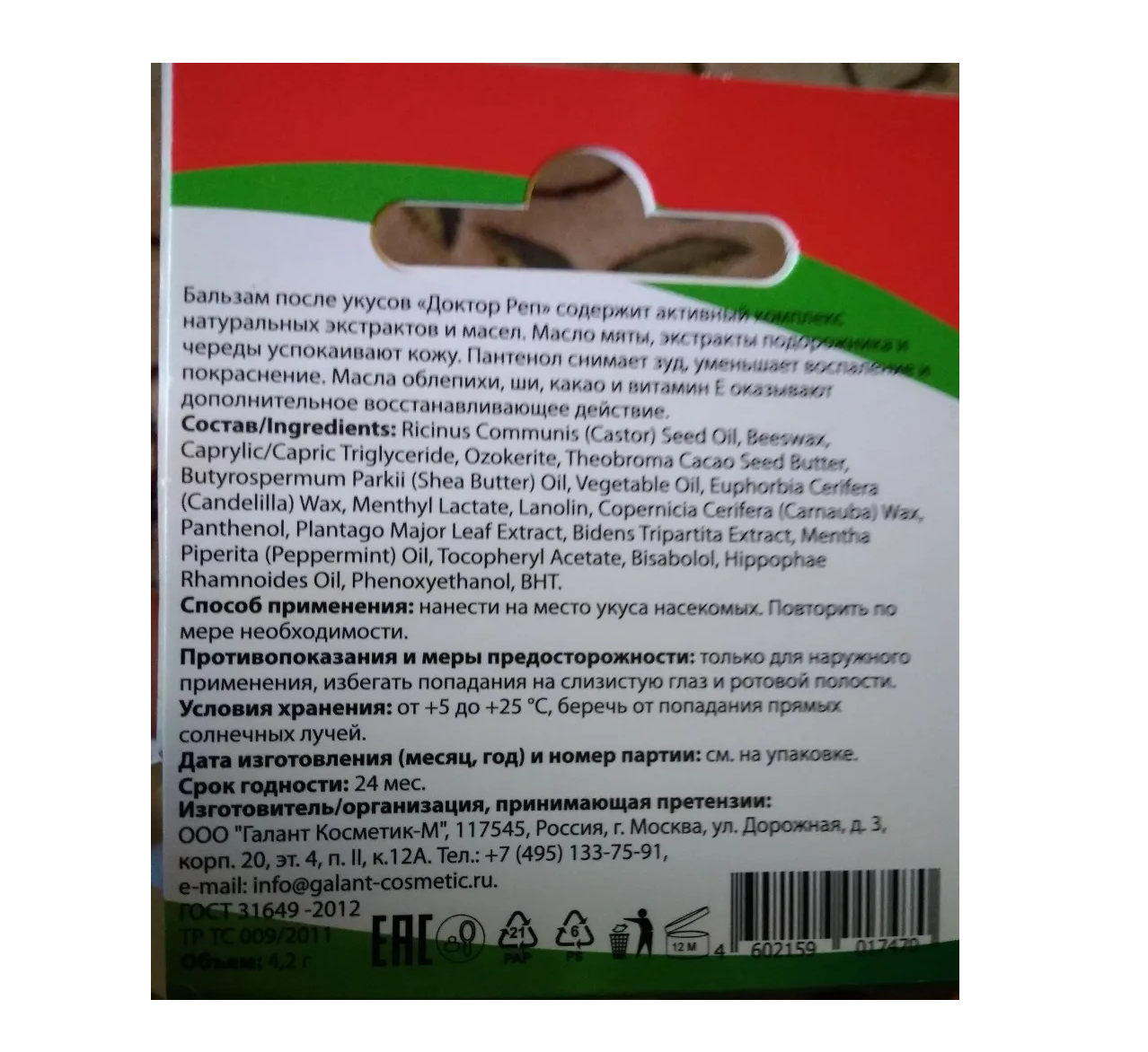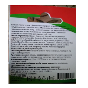 Бальзам после укусов «Доктор Реп» содержит активный комплекс натуральных экстрактов и масел. Масло мяты, экстракты подорожника и череды успокаивают кожу. Пантенол снимает зуд, уменьшает воспаление и покраснение. Масла облепихи, ши, какао и витамин Е оказывают дополнительное восстанавливающее действие.