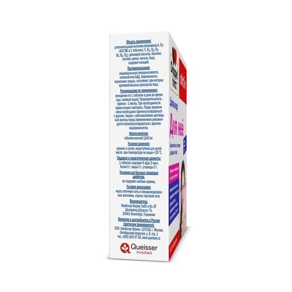 Рекомендуется в качестве биологически активной добавки к пище — дополнительного источника витаминов А, D3 (400 МЕ в 1 таблетке), С, В1, В2, В3, В5, В6, В12, фолиевой кислоты, биотина, магния, цинка, железа, йода, содержит кальций.