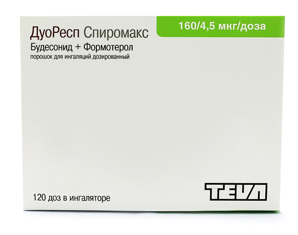Препарат ДуоРесп Спиромакс содержит формотерол и будесонид, которые имеют разные механизмы действия и проявляют аддитивный эффект в отношении снижения частоты обострений бронхиальной астмы и хронической обструктивной болезни лёгких (ХОБЛ).