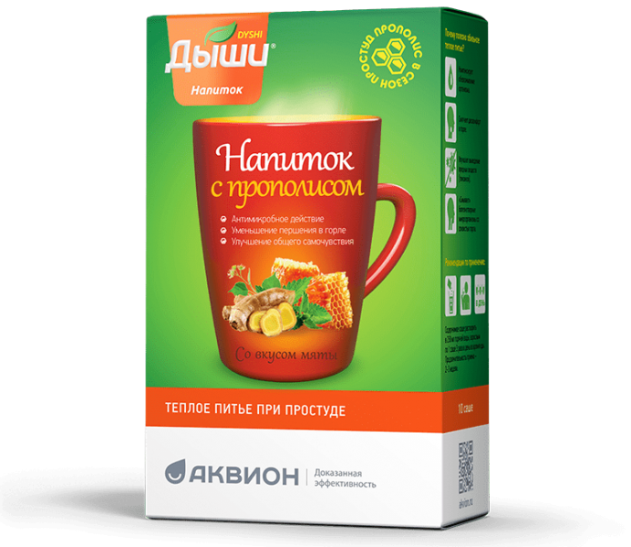 Дыши напиток с прополисом и вкусом мяты содержит витамин С и натуральные активные компоненты: прополис, экстракты шалфея, имбиря и тимьяна. Достаточно высыпать в кружку содержимое саше, добавить горячей воды – и в вашем распоряжении теплое питье.