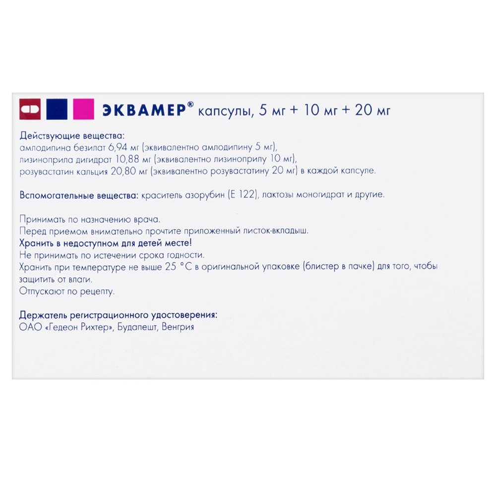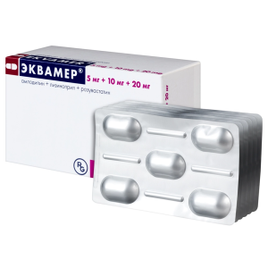 Препарат Эквамер® дозировкой 5 мг + 10 мг + 10 мг и дозировкой 10 мг + 20 мг + 10 мг содержит 48,10 мг лактозы моногидрата в каждой капсуле. Препарат Эквамер® дозировкой 5 мг + 10 мг + 20 мг и дозировкой 10 мг + 20 мг + 20 мг содержит 96,20 мг лактозы моногидрата в каждой капсуле.