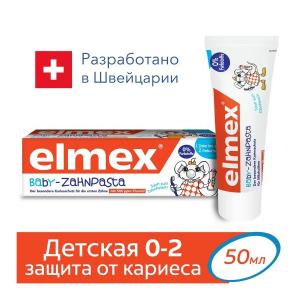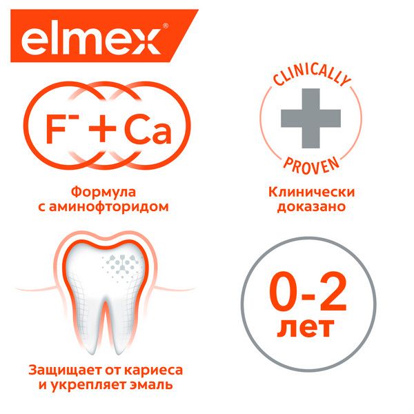 Еlmex детская зубная паста для детей с первого зуба до 2 лет разработана для ежедневного ухода и защиты мягкой, не полностью сформировавшейся эмали молочных зубов. Обладает приятным, мягким, но не сладким вкусом, что не провоцирует ребенка к проглатыванию зубной пасты. Применение детской зубной пасты с фтором защищает от кариеса. Детская зубная паста elmex содержит эффективный аминофторид в концентрации, рекомендованной стоматологами для детей (500 ppm).
