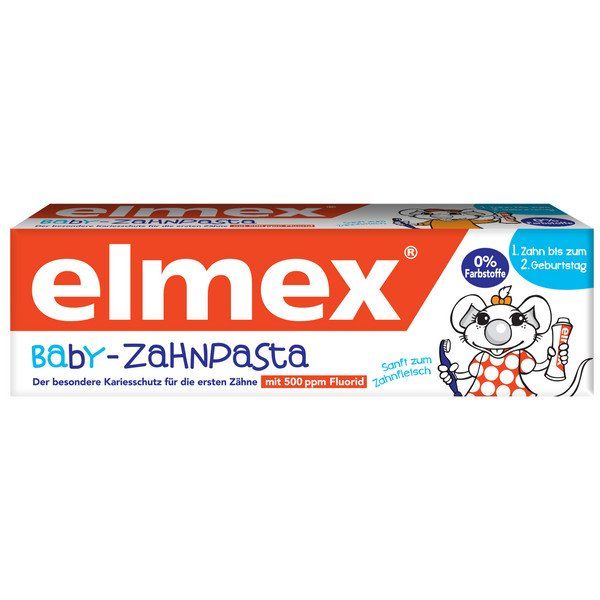 Еlmex детская зубная паста для детей с первого зуба до 2 лет разработана для ежедневного ухода и защиты мягкой, не полностью сформировавшейся эмали молочных зубов. Обладает приятным, мягким, но не сладким вкусом, что не провоцирует ребенка к проглатыванию зубной пасты. Применение детской зубной пасты с фтором защищает от кариеса. Детская зубная паста elmex содержит эффективный аминофторид в концентрации, рекомендованной стоматологами для детей (500 ppm).