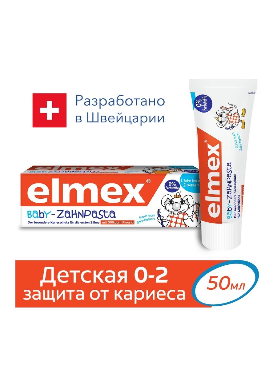 Еlmex детская зубная паста для детей с первого зуба до 2 лет разработана для ежедневного ухода и защиты мягкой, не полностью сформировавшейся эмали молочных зубов. Обладает приятным, мягким, но не сладким вкусом, что не провоцирует ребенка к проглатыванию зубной пасты. Применение детской зубной пасты с фтором защищает от кариеса. Детская зубная паста elmex содержит эффективный аминофторид в концентрации, рекомендованной стоматологами для детей (500 ppm).