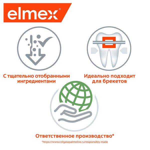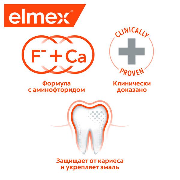 Зубная паста Colgate Элмекс ЗАЩИТА ОТ КАРИЕСА с высокоэффективным аминофторидом реминерализирует, укрепляет эмаль и защищает зубы от кариеса. Предназначена для ежедневной гигиены полости рта с целью обеспечения длительной защиты от кариеса, снижения растворимости и укрепления зубной эмали. Аминофторид, содержащийся в зубной пасте Colgate элмекс ЗАЩИТА ОТ КАРИЕСА, формирует устойчивый слой фторида кальция на поверхностях зубов, который обеспечивает длительную и высокоэффективную защиту от воздействия кислот.