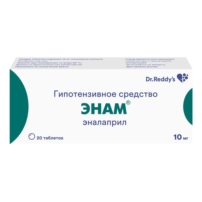 Энам® относится к группе ингибиторов АПФ, обладает гипотензивным действием, механизм развития которого связан с уменьшением образования из ангиотензина I ангиотензина II, снижение концентрации которого ведёт к прямому уменьшению секреции альдостерона. При этом понижается общее периферическое сопротивление сосудов, систолическое и диастолическое артериальное давление (АД), пост- и преднагрузка на миокард. Расширяет артерии в большей степени, чем вены, при этом рефлекторного повышения числа сердечных сокращений не отмечается. Уменьшает деградацию брадикинина, увеличивает синтез простагландинов. Гипотензивный эффект более выражен при высокой концентрации ренина в плазме, чем при нормальной или сниженной.