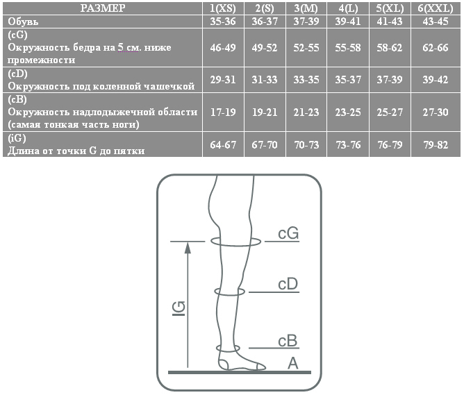 Размер изделия подбирается строго по анатомическим меркам конечности. Изделия большего размера не оказывают должного эффекта, меньшего - вызывают существенный дискомфорт при ношении. Верхний край лечебного трикотажа должен располагаться на 5-10 см выше пораженной вены.