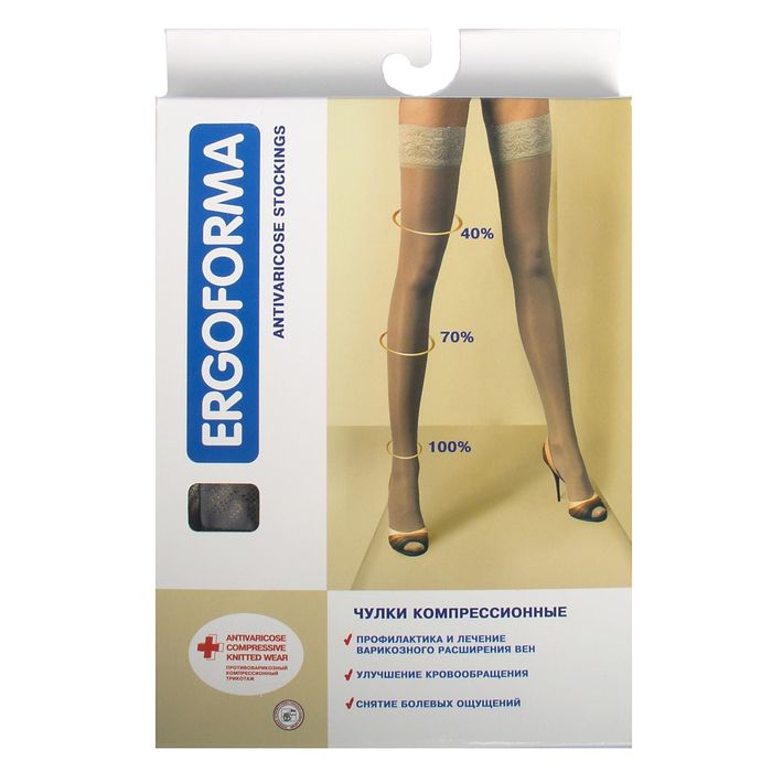 Чулки Ergoforma 221 второго класса компрессии (23-32 мм рт.ст.). выполнены из специального материала, который создает строго градуированную степень компрессии: 100 % в самой узкой части щиколотки, 70% в области голени и 40% в области бедра.