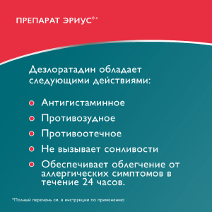 Действие лекарственного препарата Эриус® начинается в течение 30 минут после приёма внутрь и продолжается в течение 24 часов.
