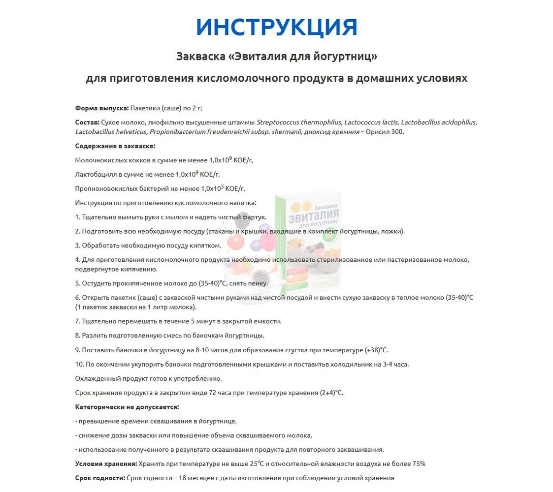 Категорически не допускается: превышение времени сквашивания в йогуртнице, снижение дозы закваски или повышение объема сквашиваемого молока, использование полученного в результате сквашивания продукта для повторного заквашивания.