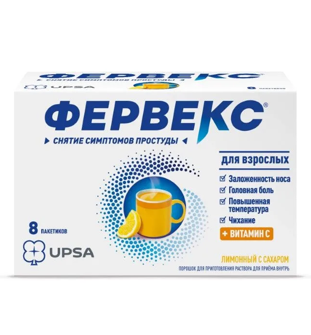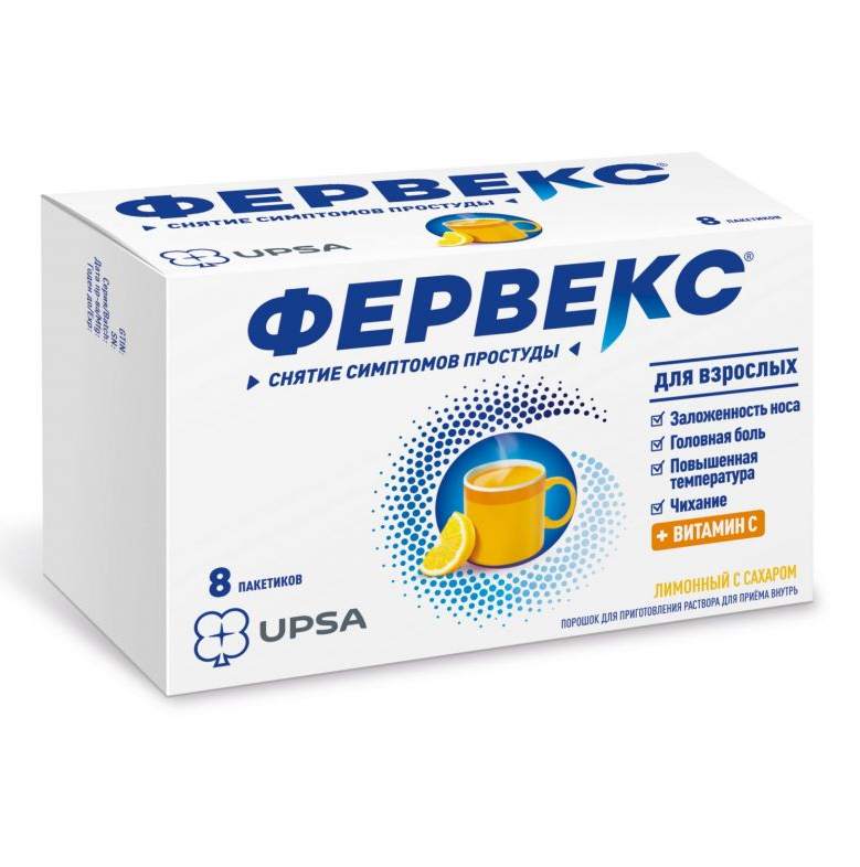 Фервекс® — комбинированный препарат, который содержит парацетамол, фенирамин и аскорбиновую кислоту. Парацетамол — ненаркотический анальгетик, блокирует циклооксигеназу, преимущественно в центральной нервной системе, воздействуя на центры боли и терморегуляции оказывает анальгезирующее и жаропонижающее действие.