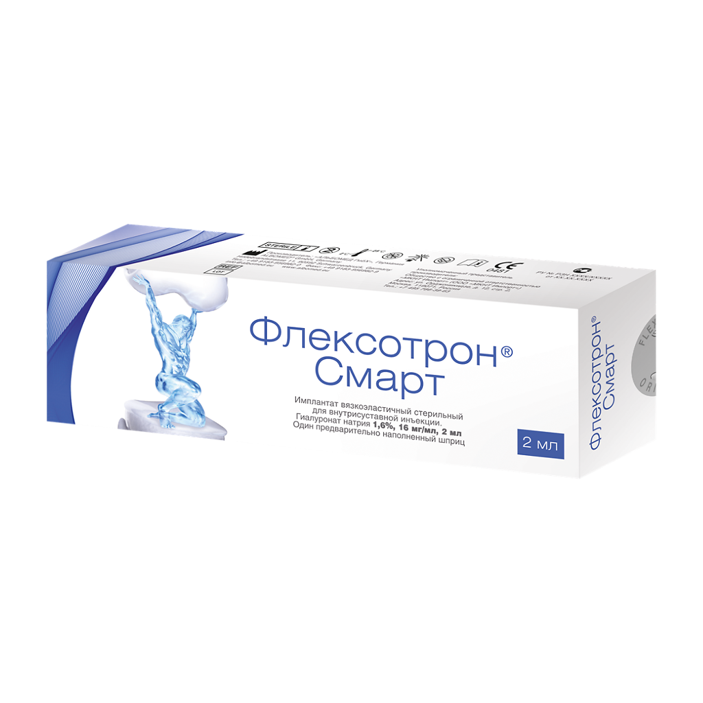 Имплантат вязкоэластичный стерильный для внутрисуставной инъекции ФЛЕКСОТРОН® Смарт (FLEXOTRON® Smart), гиалуронат натрия 1,6 %, 16 мг/мл, 2 мл.