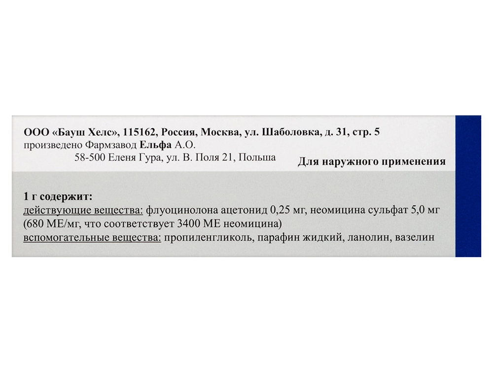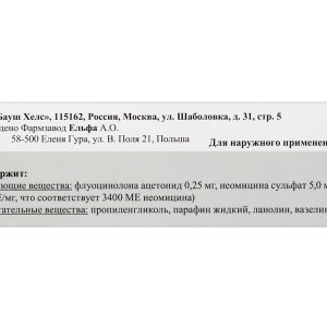 Действующие вещества: флуоцинолона ацетонид 0,25 мг, неомицина сульфат (680 МЕ/мг, что соответствует 3400 МЕ неомицина) — 5,0 мг.