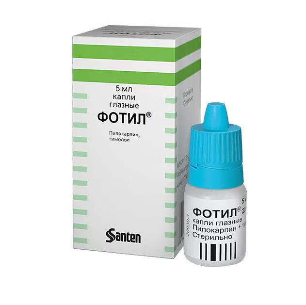 Глазные капли Фотил® содержат два активных вещества. Пилокарпин является парасимпатомиметикбм, который стимулирует м-холинергические рецепторы. При закапывании в глаз пилокарпин вызывает миоз, спазм аккомодации и снижает внутриглазное давление. Снижение внутриглазного давления обусловлено сокращением цилиарной мышцы и мышцы радужной оболочки глаза, которое приводит к расширению угла передней камеры глаза и изменяет физическую структуру трабекулярной сети, облегчая отток водянистой влаги. Этот эффект сохраняется от 4 до 14 час. Тимолол, являясь бета-адреноблокатором, предотвращает связывание симпатомиметических нейромедиаторов с бета1- и бета2-адренорецепторами. Он снижает внутриглазное давление, уменьшая продукцию водянистой влаги. Мишени действия тимолола — бета2-адренергические рецепторы в цилиарном теле. Гипотензивный эффект наступает через 20 минут после инстилляции, достигает максимума через 2 часа и продолжается около 24 часов.