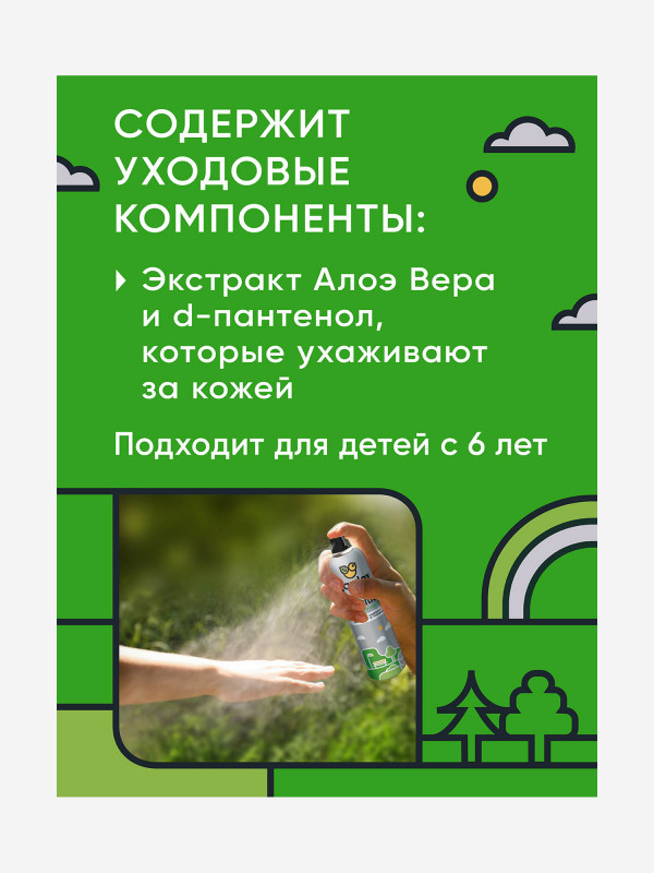 Наносить на кожу не более 2 раз в сутки. После возвращения в помещение смыть средство с кожи. Одному человеку использовать для обработки одежды не более 2 баллонов в сутки. Повторную обработку проводить по мере необходимости, но не чаще чем через 3 суток. Не обрабатывать одежду на человеке и не надевать ее до полного высыхания. Не допускать попадания средства в органы дыхания, рот, глаза. В случае попадания на поврежденные участки кожи и в глаза - обильно промыть их теплой водой. При попадании в рот - прополоскать, в органы дыхания - выйти на свежий воздух, при необходимости обратиться к врачу. Предохранять от попадания на лакированные поверхности, изделия из пластика и синтетических волокон. Предохранять от прямых солнечных лучей и нагревания выше 40°С! Хранить в недоступных для детей местах! Ёмкость под давлением! Не вскрывать и не сжигать даже после использования! Не разбирать и не давать детям! ОГНЕОПАСНО! Не распылять вблизи открытого огня и раскаленных предметов! Не курить! После использования или по окончании срока годности продукцию и упаковку утилизировать как бытовой отход. Не употреблять внутрь!