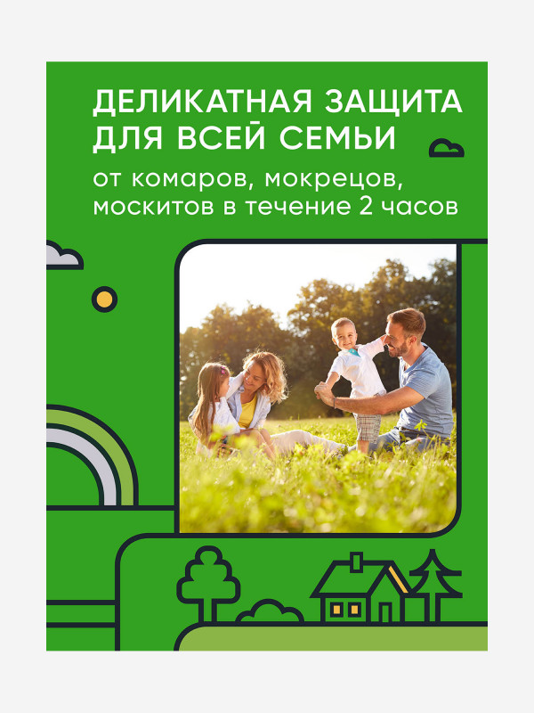 Защита взрослых и детей с 6 лет от нападения комаров, мокрецов и москитов.