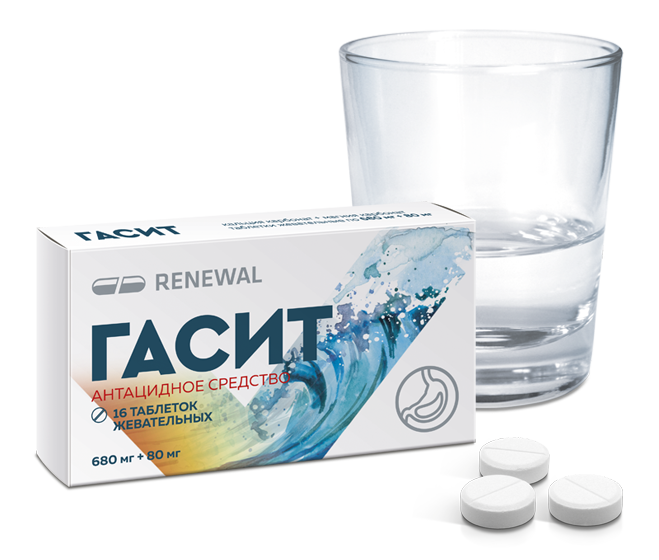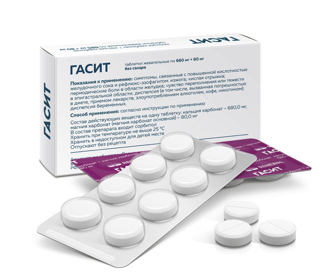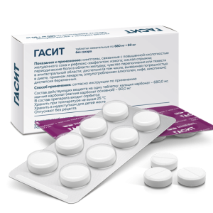 Антацидный препарат местного действия. Таблетка препарата Гасит содержит антацидные вещества — кальция карбонат и магния карбонат, которые обеспечивают быструю и продолжительную нейтрализацию избыточной соляной кислоты желудочного сока, тем самым оказывает защитное действие на слизистую оболочку желудка.