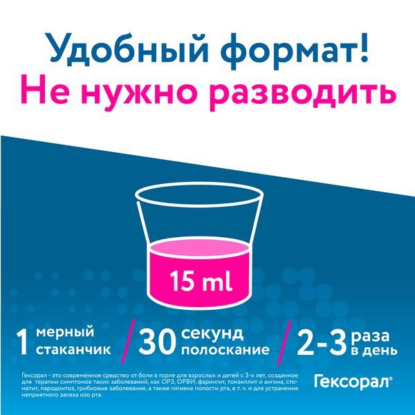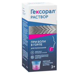 Лекарственный препарат «Гексорал®», раствор для местного применения можно применять для полоскания полости рта и глотки только в том случае, если больной может выплюнуть раствор после полоскания.