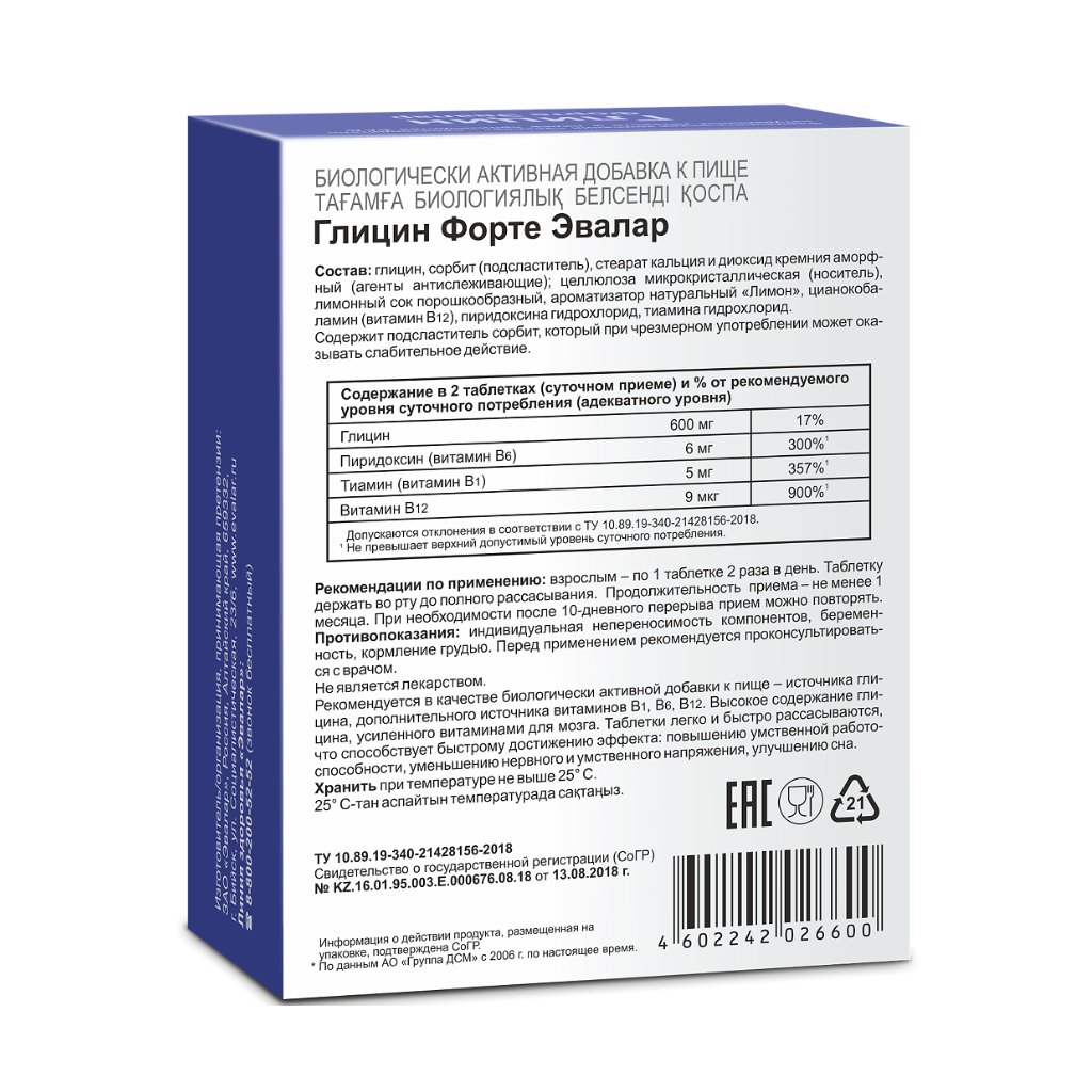 Глицин форте Эвалар таблетки для рассасывания 0,6г №60 + 20 таблеток в подарок