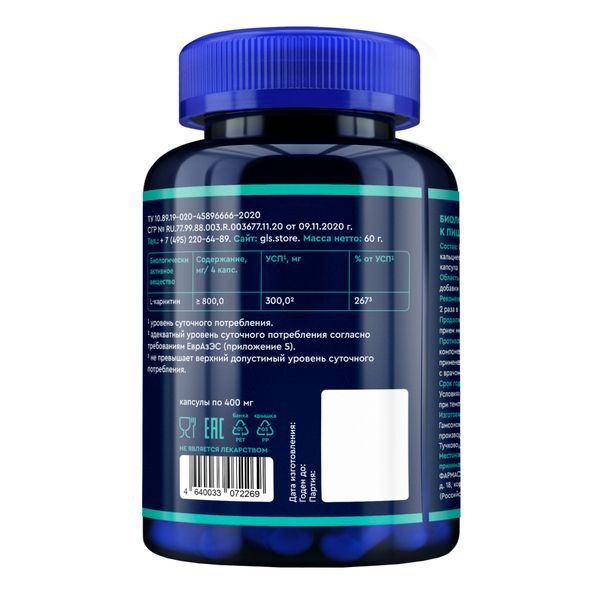 GLS L-карнитин 800 капсулы массой 400мг №120